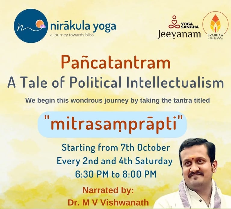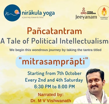 We begin this wondrous journey by taking the tantra titled "mitrasaṃprāpti" that has 6 stories. The classes will be online (Zoom) and narration and discussions shall take place in English as mode of communication language. It shall be covered in a span of 6 months with two classes of 90 minutes each on every 2nd and 4th Saturday.